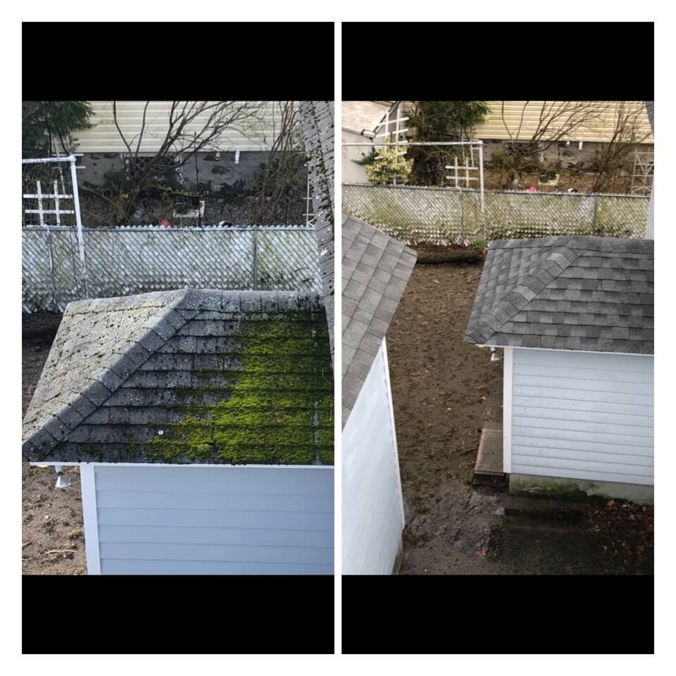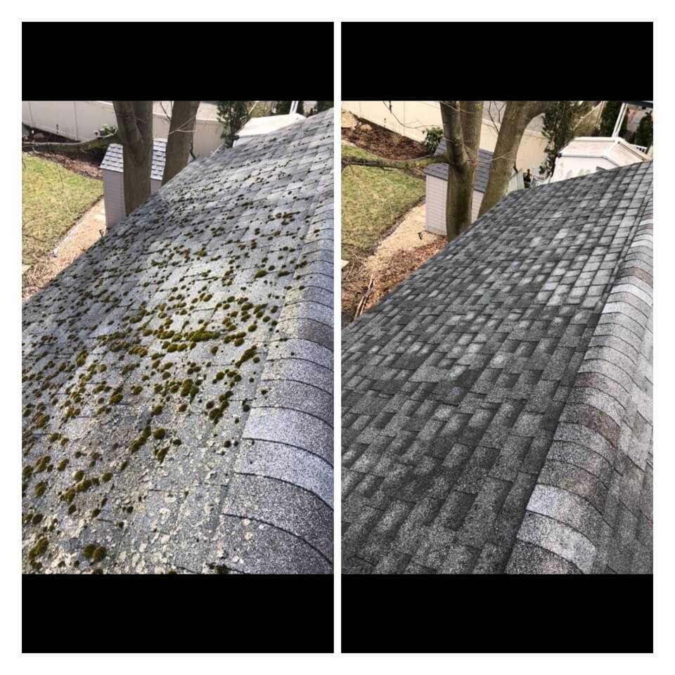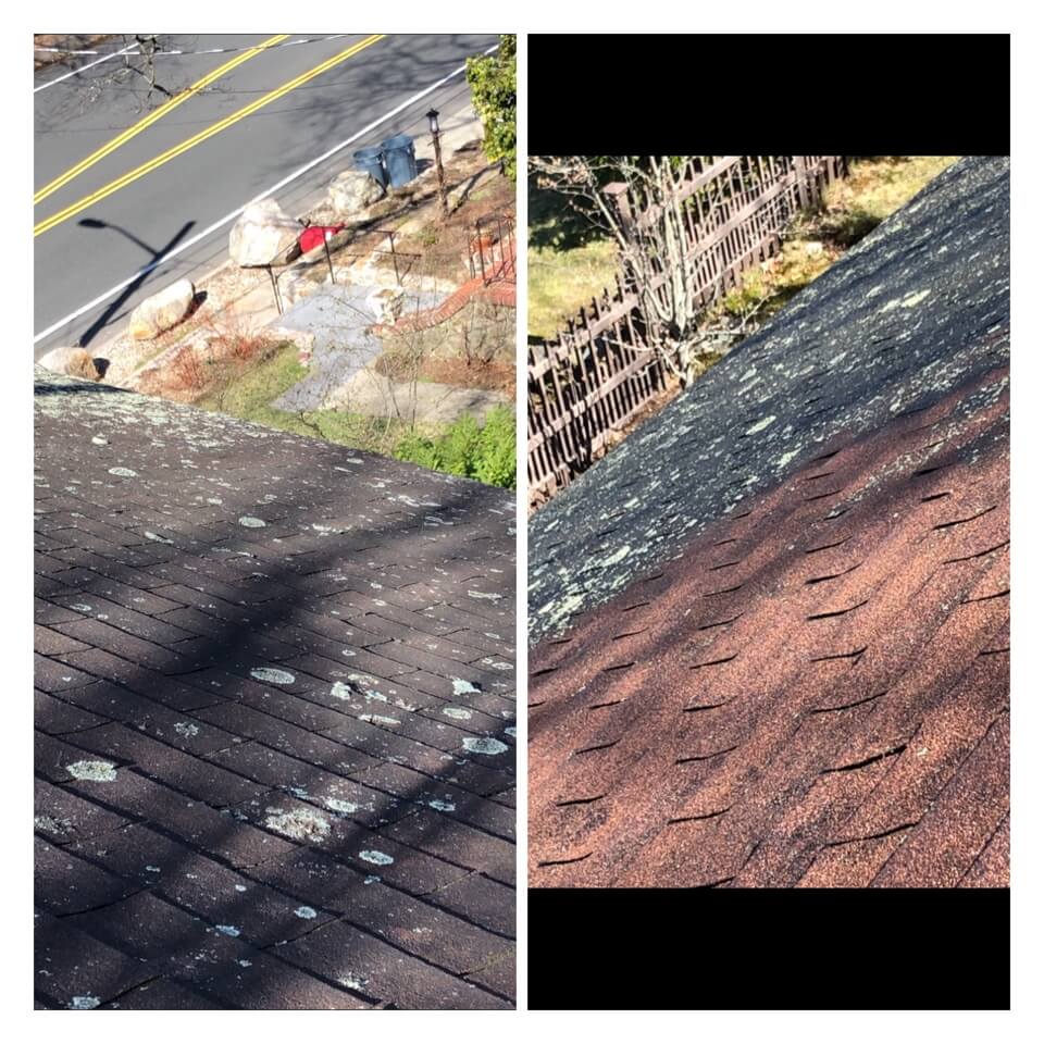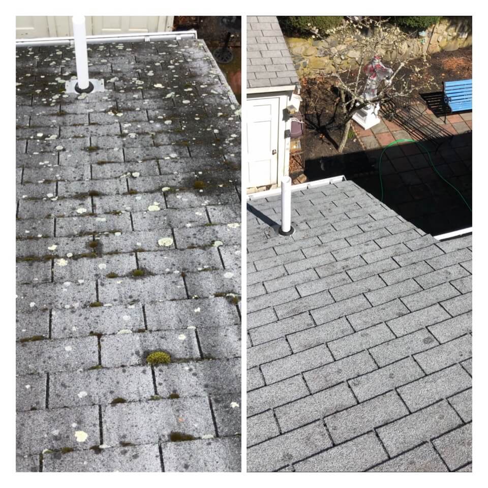 HiCleaners is the most experienced company in Brockton, MA that deals with roof washing and roof soft washing. All of our employees are trained to recognize precise solution mixing ratios to provide you with the safest and most effective soft washing service. Roofs are a commonly neglected part of a house due to the fact that most people don’t have ladders to access it, so it is very easy to just leave it alone and forget about problems that may start to arise. Just like many home owners, discoloration and small bits of moss on a roof can be overlooked because of the misconception that it is just aesthetic. However, it isn’t just aesthetic, the moss slowly lifts the granules off the shingles which in turn shorten the life of the shingle. The moss also spreads, just like any bacteria if it is left alone for too long, it can quickly become a problem that spirals out of control. Call HiCleaners for a free quote, we only use the most advanced eco-friendly solutions and equipment to make sure the job is done right, for the safety of the employees, your plants, grass, pets, and children.